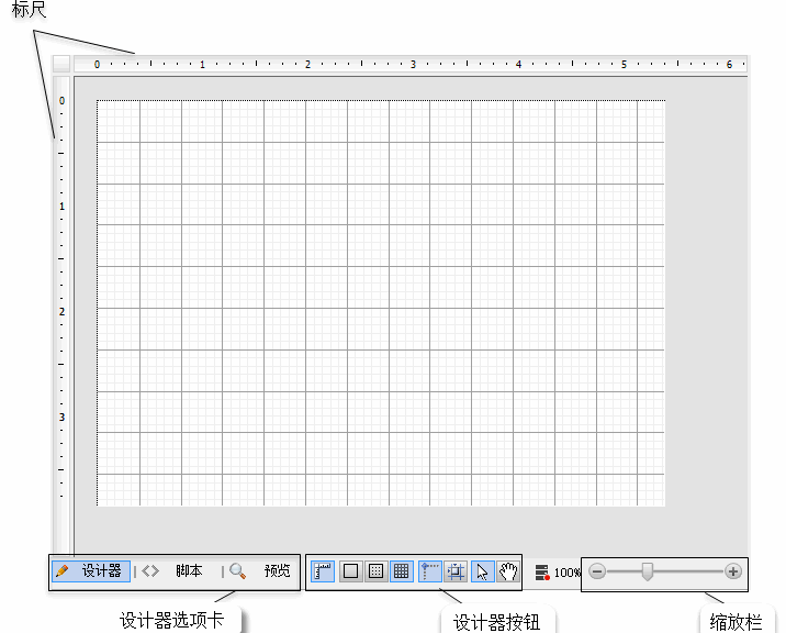 设计器按钮位于设计界面下方设计器选项卡的旁边。尺寸线、隐藏网格、点、线、对齐线,和网格线对齐按钮可帮助您对齐报表控件和数据区域。选择模式和平移模式按钮决定您是否可以选择设计界面中的控件,或移动放大报表的可见区域。